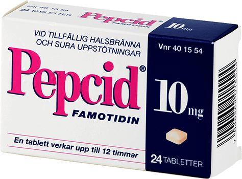 PEPCID® (famotidin) tablett. Läkemedel innehållande H2-antagonist för symtomlindring vid tillfällig halsbränna och sura uppstötningar. Från 12 år. Max 2 veckors behandling. Läs alltid bipacksedeln, särskilt vid annan sjukdom, allergi, graviditet eller amning. © McNeil Sweden AB, Box 4007, 169 04 Solna, 2020. SE-PE-2000006
